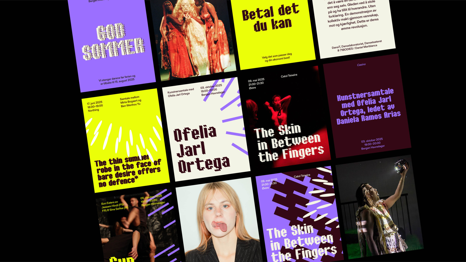 Da BIT endelig fikk plass på Sentralbadet etter 14 år med nomadisk drift, kontaktet de oss for å lage en ny og endelig helhetlig identitet. Vi lot oss inspirere av spenningen og samholdet som oppstår rundt moderne dans og teater. Muligheten for friksjon og dansens flyt. Det uventede og spenningen av å ikke helt vite hva som skal skje.