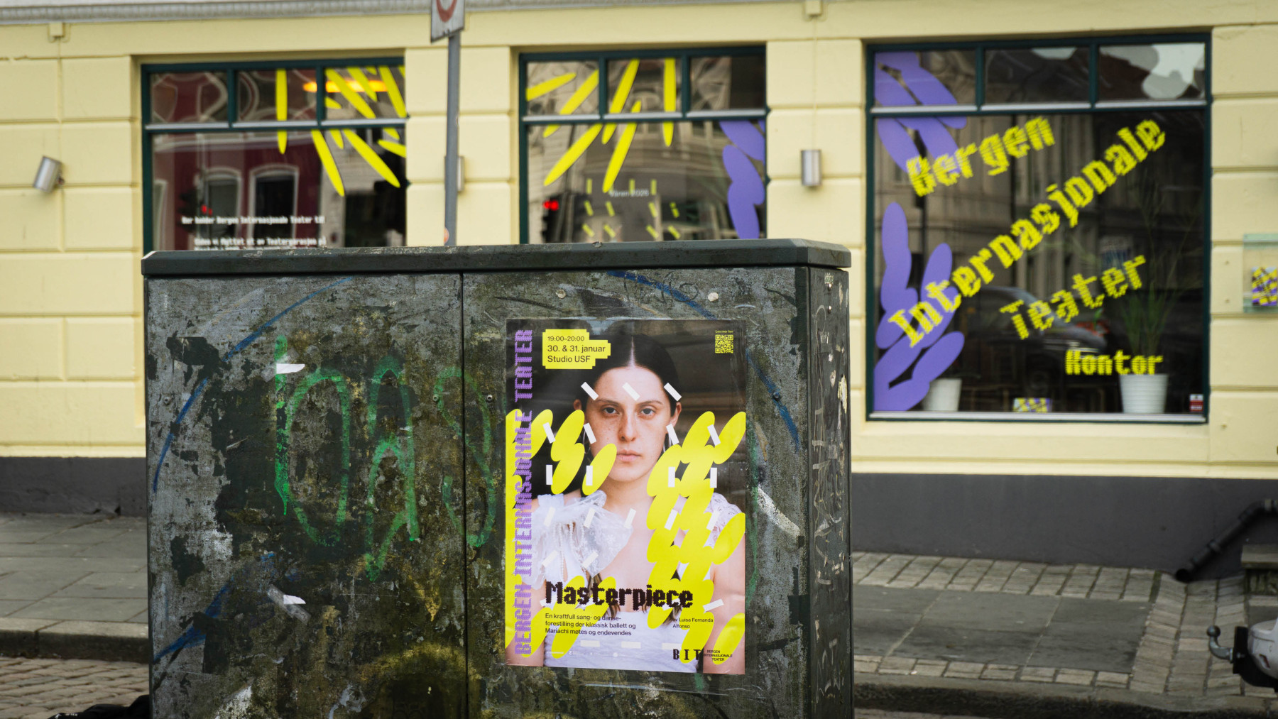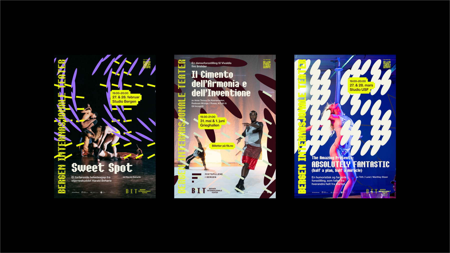 Da BIT endelig fikk plass på Sentralbadet etter 14 år med nomadisk drift, kontaktet de oss for å lage en ny og endelig helhetlig identitet. Vi lot oss inspirere av spenningen og samholdet som oppstår rundt moderne dans og teater. Muligheten for friksjon og dansens flyt. Det uventede og spenningen av å ikke helt vite hva som skal skje.