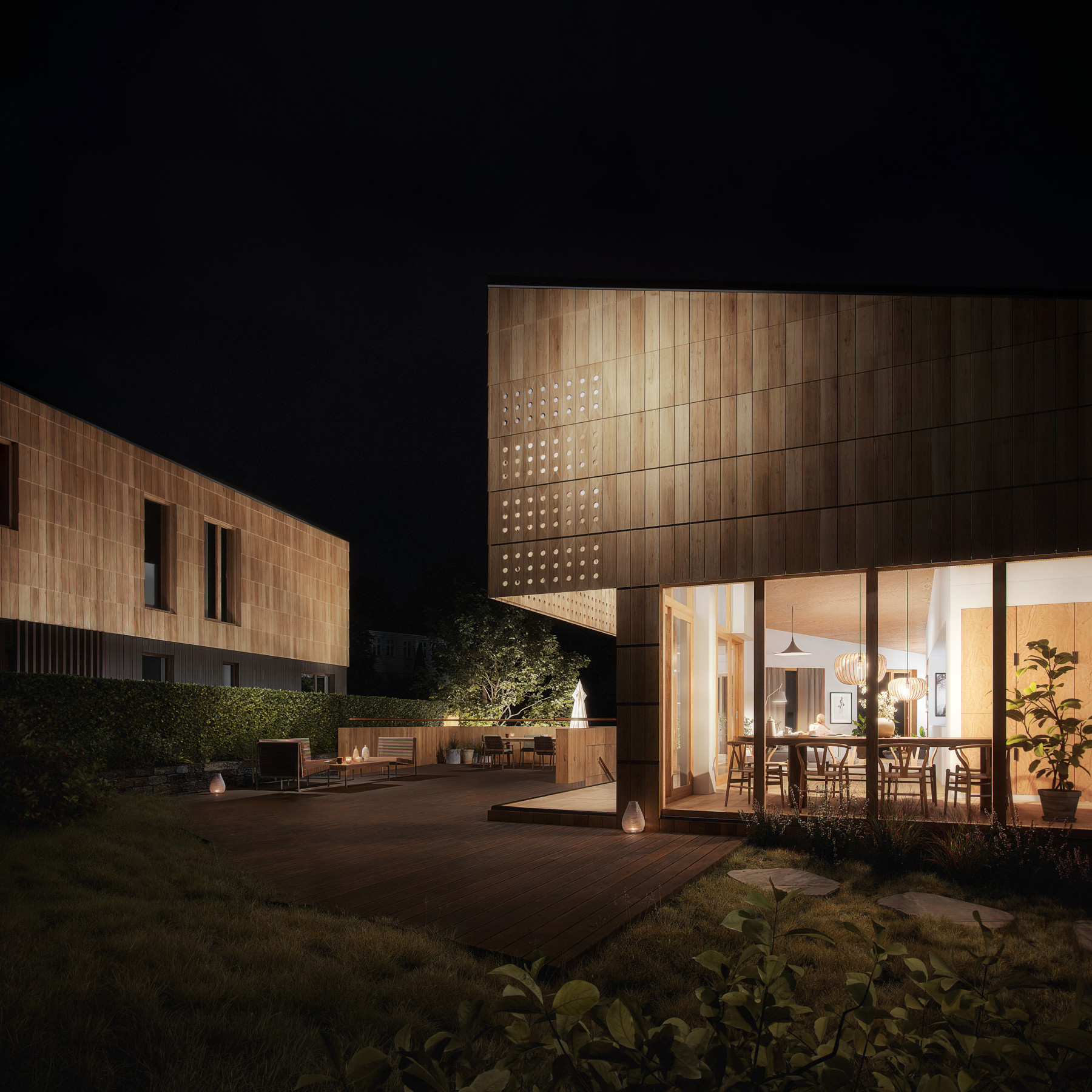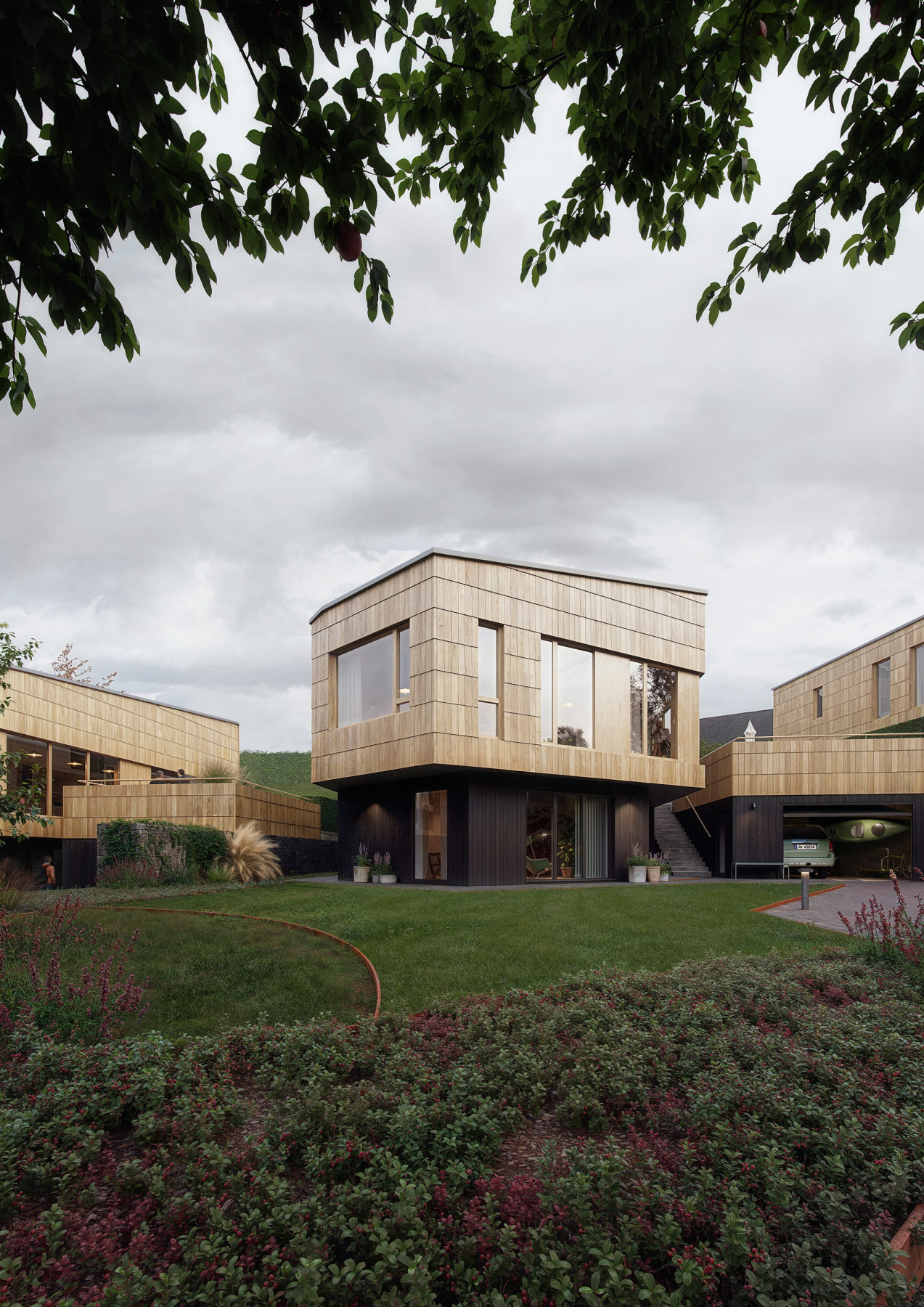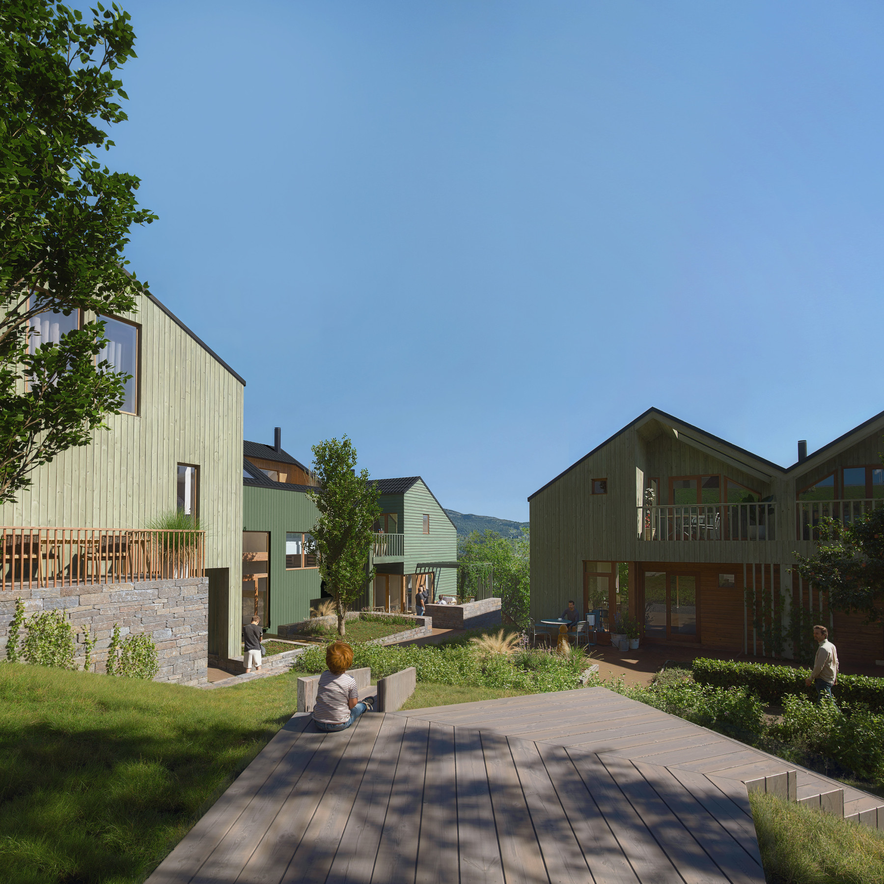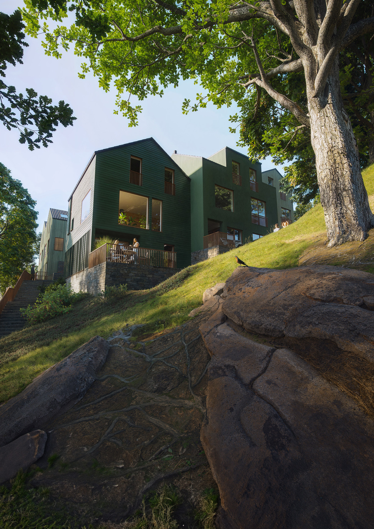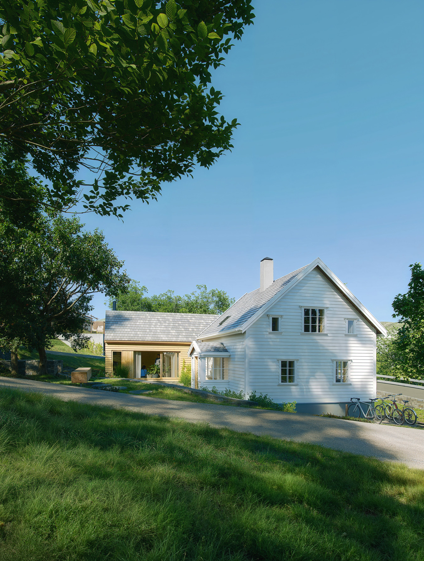 Noen bevaringsverdige gamle bygg får nytt liv som hybrider av fortid og framtid. En gammel løe og et våningshus fusjoneres sammen med nybygg til helt unike hjem. Illustrasjonene er laget til prospekt og promoterings material.